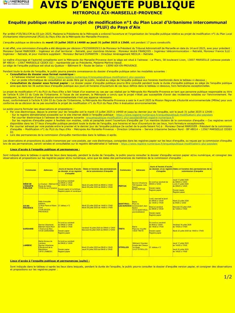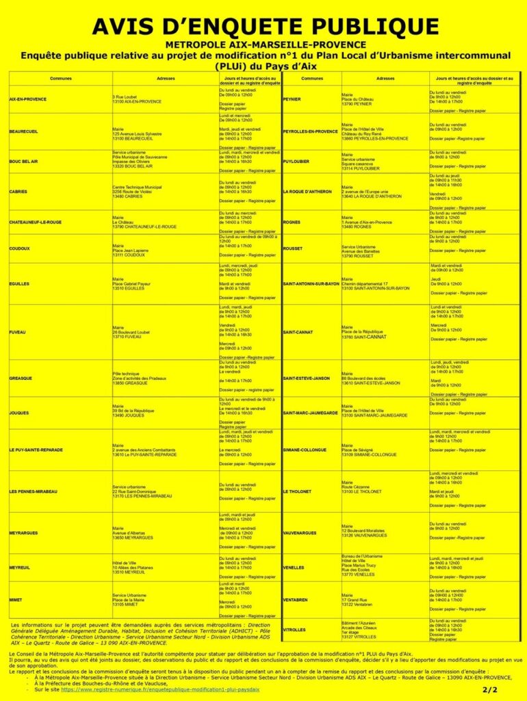 Enquête publique relative au projet de modification n°1 du Plan Local d’Urbanisme intercommunal (PLUi) du Pays d’Aix.